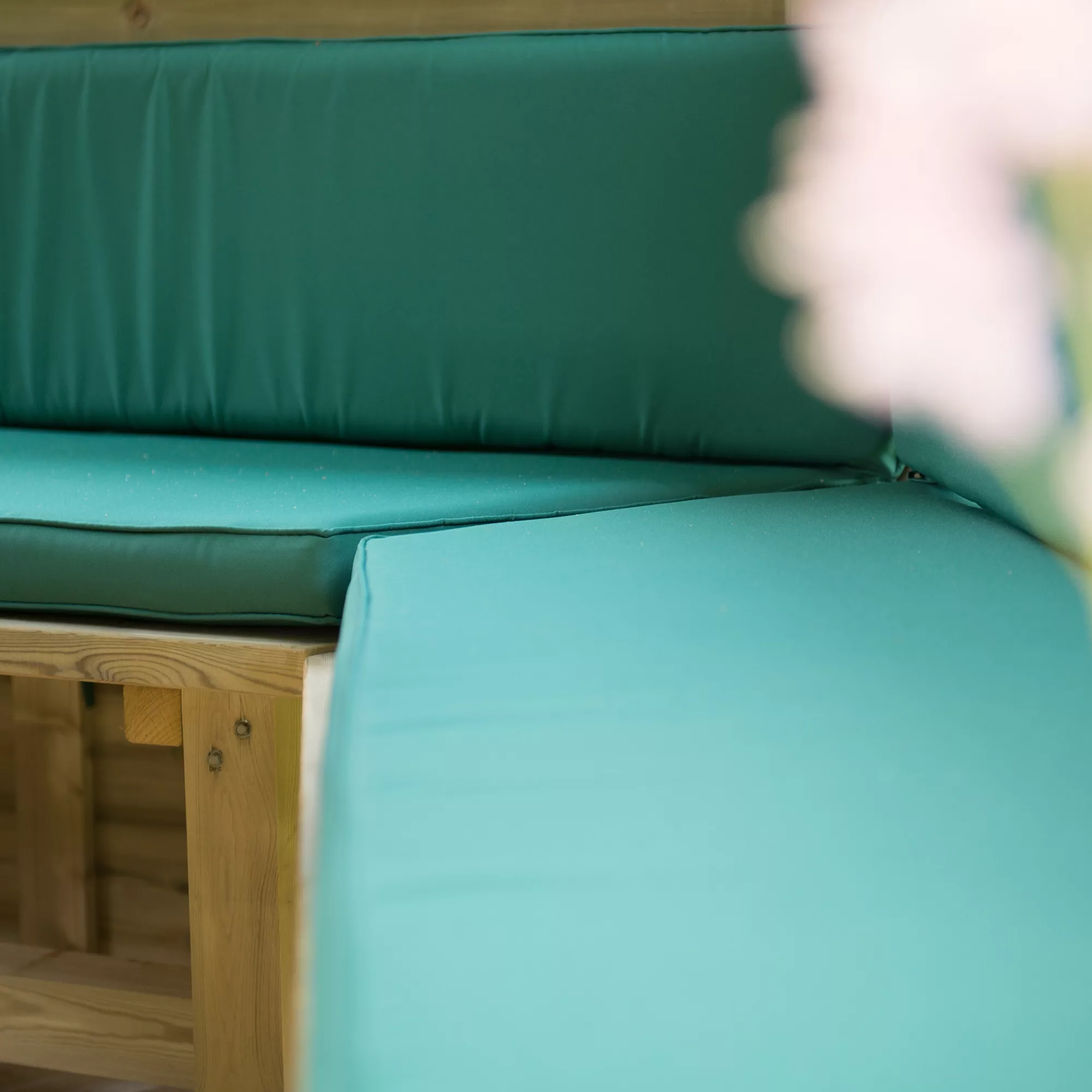 - Includes set of 5 custom made green seat and back bench cushions