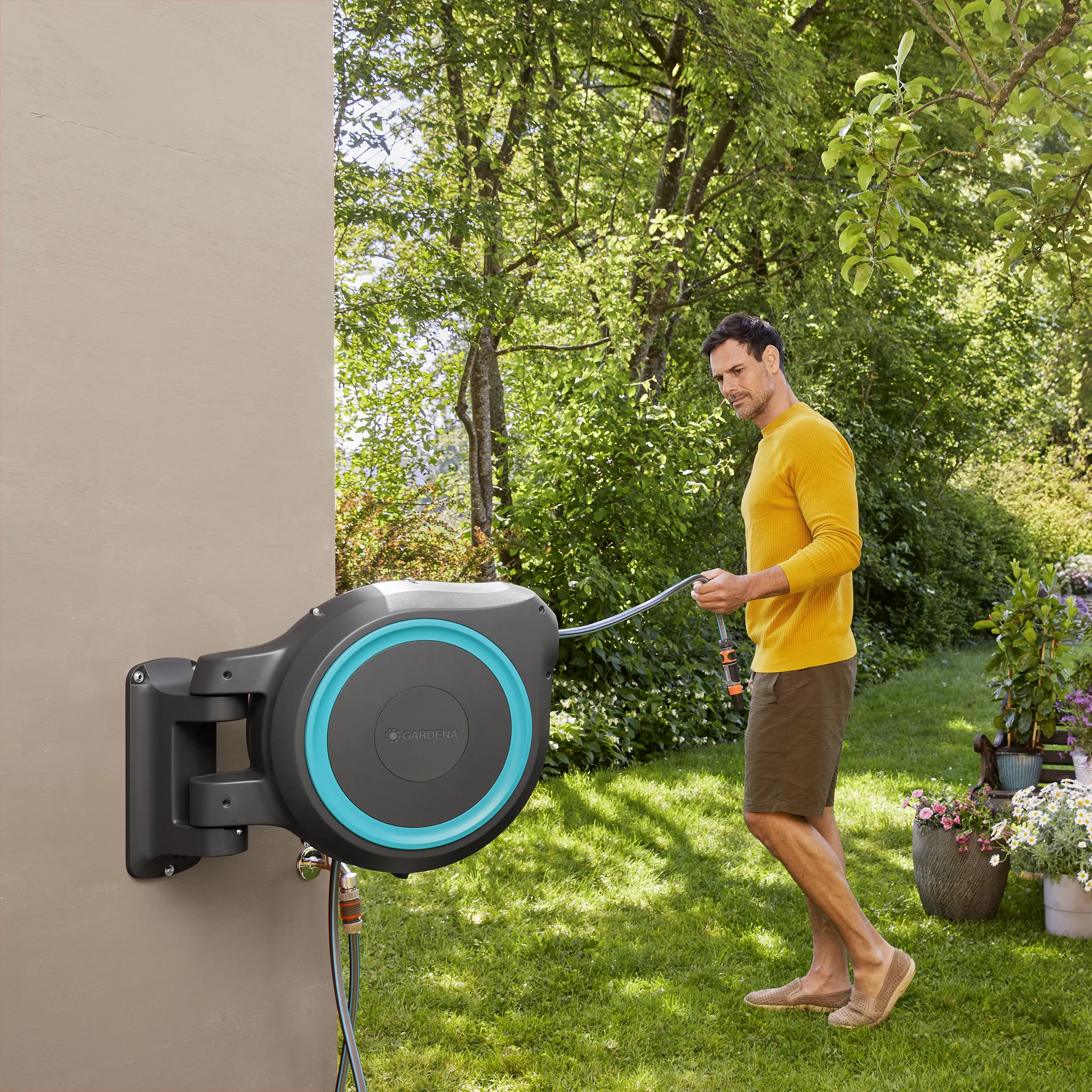 - Ready for immediate use: Including wall bracket, 35 m hose, 1.5 m connecting hose, all required Original GARDENA System Parts and a nozzle with two different spray jet options